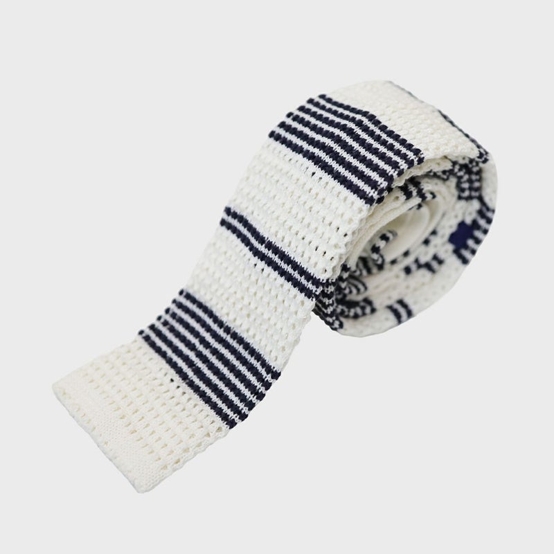 清涼感のある白で軽やかな印象のニットタイは、ビジネスシーンからカジュアルなスタイルにも合う、夏も使いやすいネクタイです。
