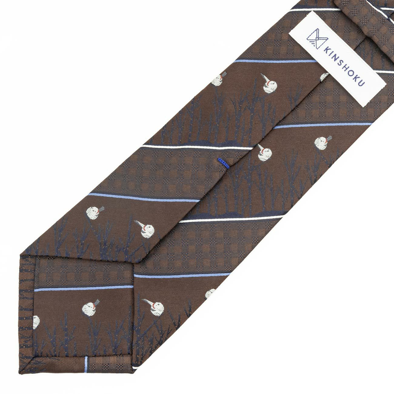 KINSHOKUネクタイ 白樺とシマエナガモチーフチェックストライプ・ブラウン