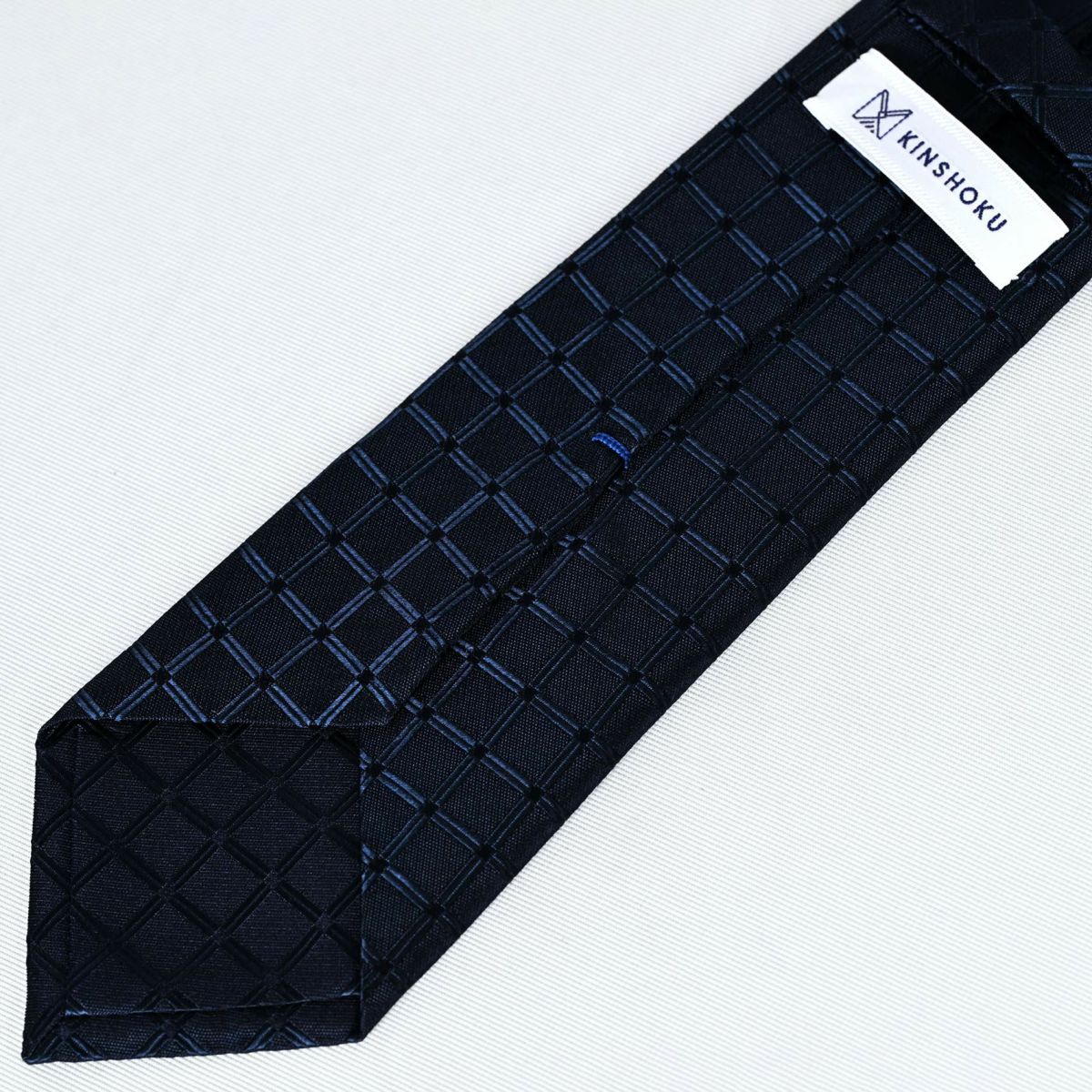 KINSHOKUネクタイの特徴をまとめた画像。トラディショナルからトレンドまで、高品質を贈る。ビジネスに使いやすいベーシックなデザインも多くご用意。裏地部分にも表地を使用。指先で高級感を感じられます。