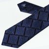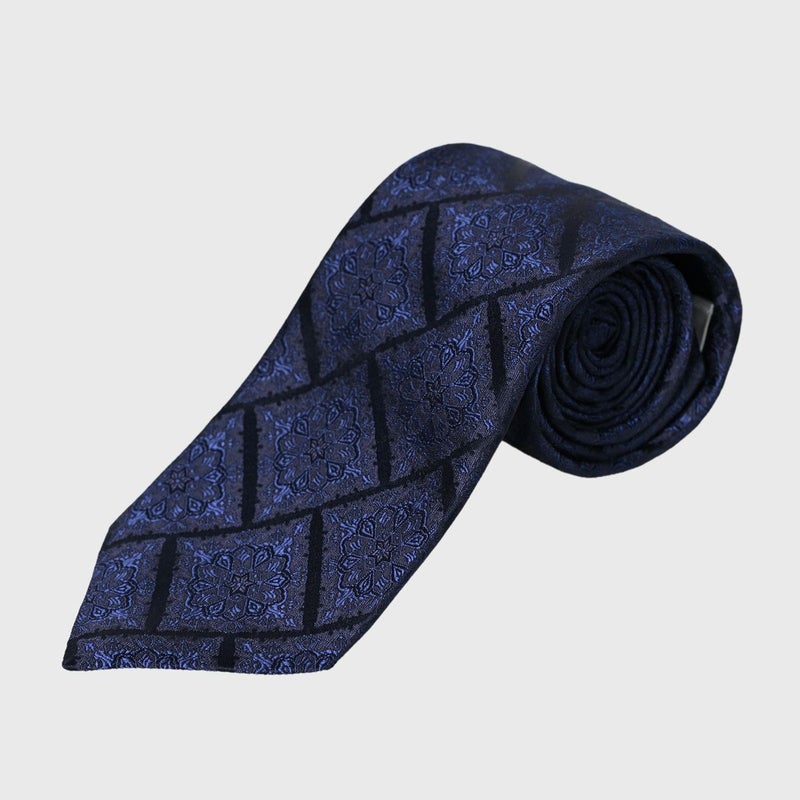 地の紺と同系色の色で絶妙な濃淡を表現し、落ち着いた上品な印象を胸元にあたえるメダリオンタイ。