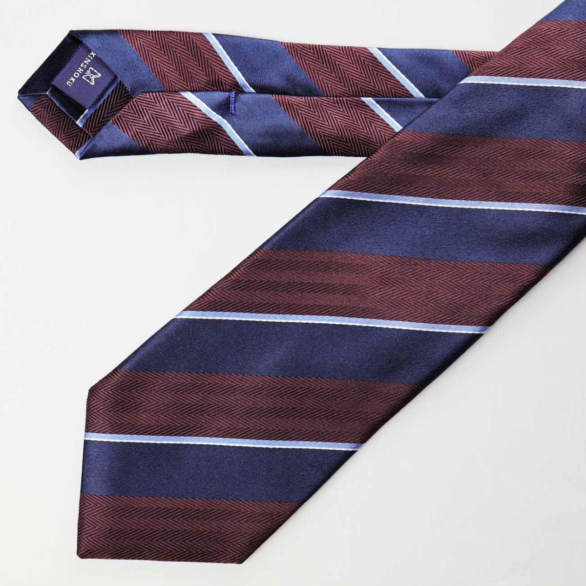 KINSHOKUネクタイの特徴をまとめた画像。トラディショナルからトレンドまで、高品質を贈る。ビジネスに使いやすいベーシックなデザインも多くご用意。裏地部分にも表地を使用。指先で高級感を感じられます。