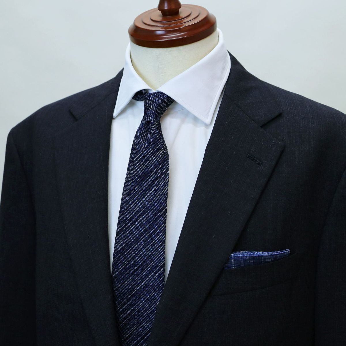 ブラックの生地にはネイビーの緯糸を合わせ、スーツに馴染みやすい色合いに。
