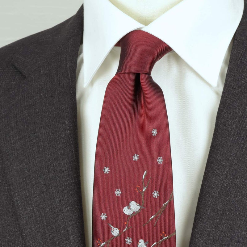 KINSHOKUネクタイ 白樺の森とシマエナガモチーフパネル・ワイン