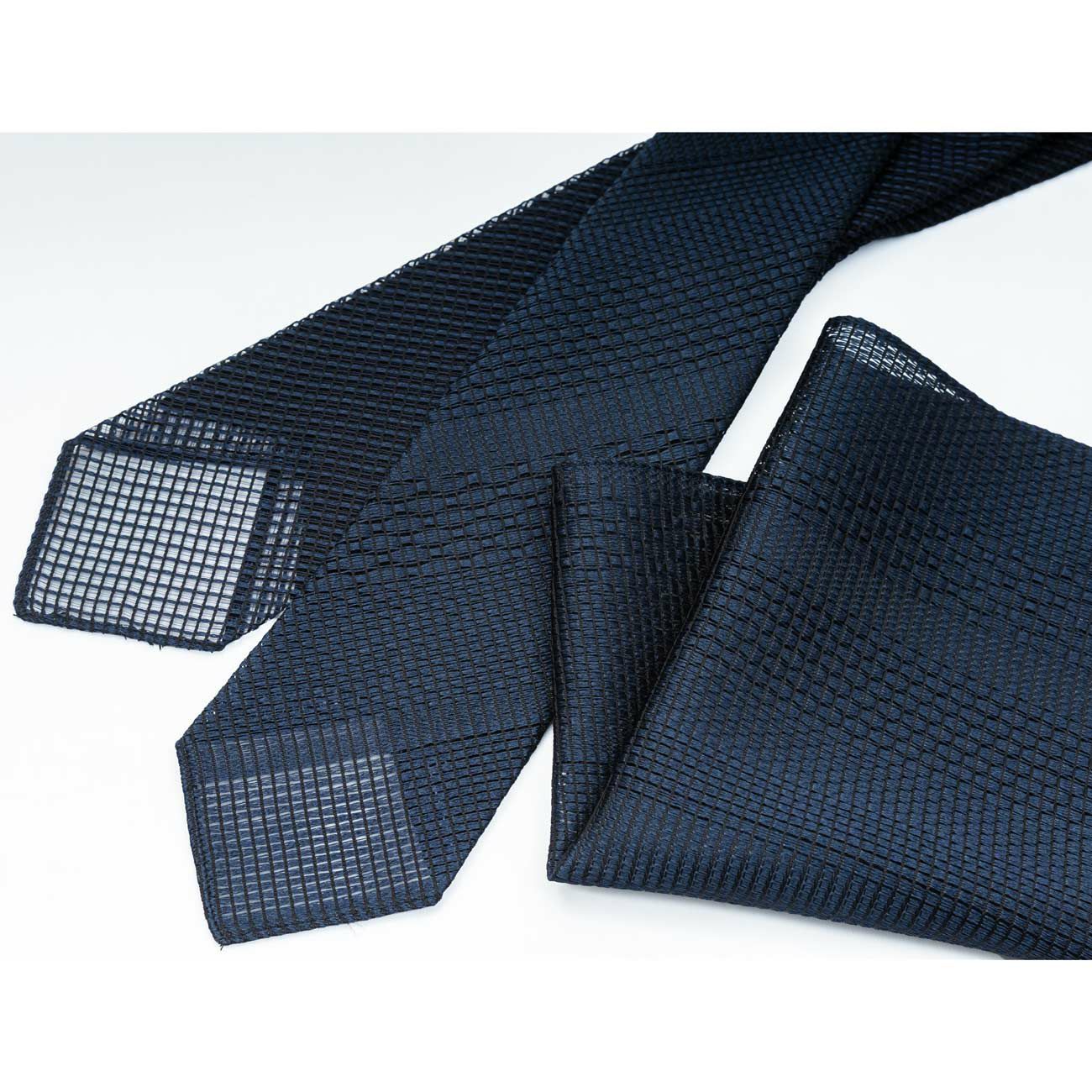 紋紗織ネクタイと同じ、ハリのある生地を使用。適度な固さが生地の形状を維持、ボリュームのある胸元の演出が可能となっています。きっちり折り畳むことでスッキリしたセットも可能です。シーンに合わせた使い方のしやすいポケットチーフです。ボリュームを作ると生地の透けを楽しめ、より爽やかな印象を作ることができます。