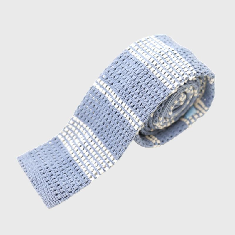 清涼感のある水色で、軽やかな印象のニットタイは、ビジネスシーンからカジュアルなスタイルにも合う、夏も使いやすいネクタイです。