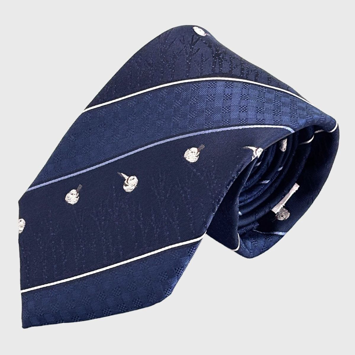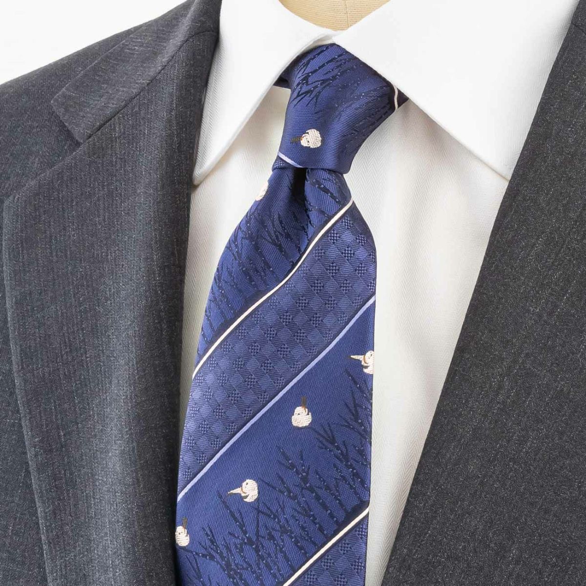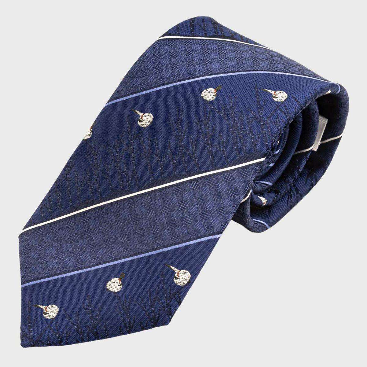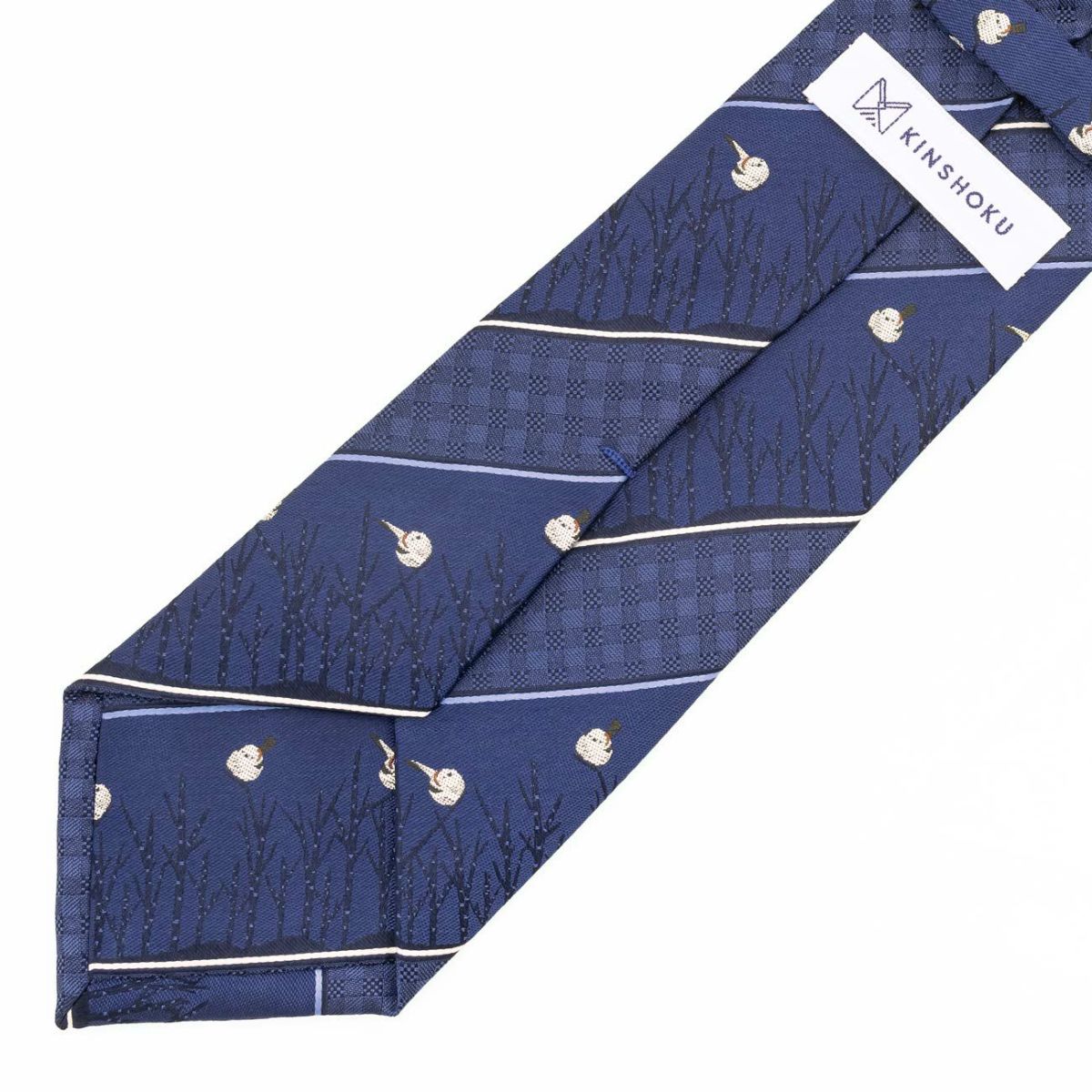 KINSHOKUネクタイ 白樺とシマエナガモチーフチェックストライプ・ネイビー