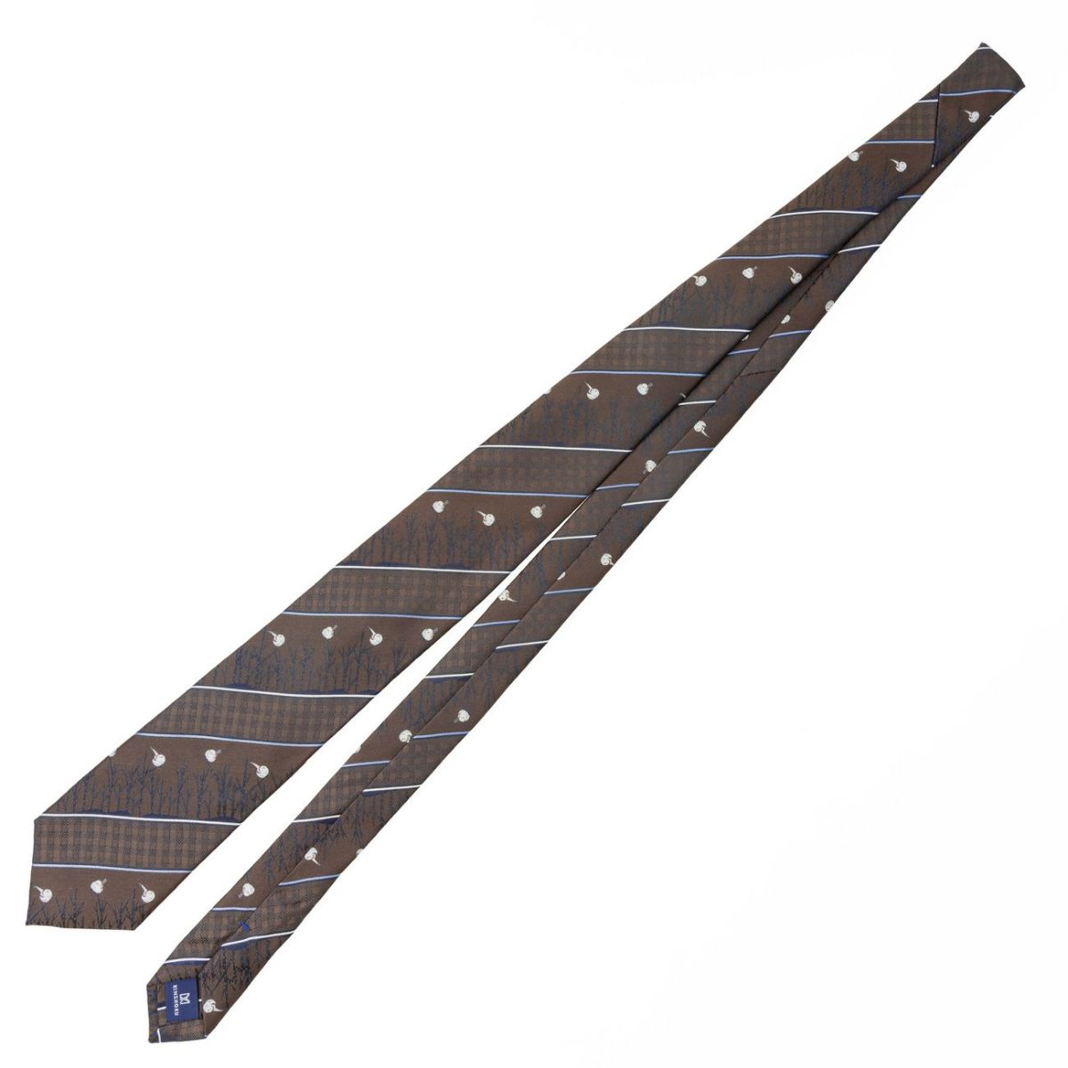 KINSHOKUネクタイ 白樺とシマエナガモチーフチェックストライプ・ブラウン
