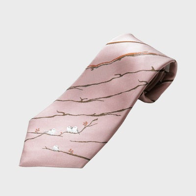 落ち着いたピンク色で、派手すぎない色です。 初めて締めた日に、「ネクタイが素敵」と褒められました。 環境によるのでしょうが、モニターで確認した色味とイメージが一致していました。 剣先のみにシマエナガのモチーフがあり、目立たぬかわいらしさで気に入っています。 ネクタイは薄手の軽やかな生地で、ごつごつした結び目になりません。 結び目のえくぼもしっかりと出て、首元が華やぎました。